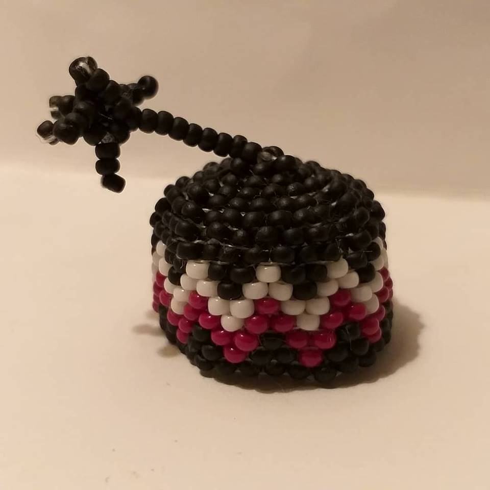 Olivia Lya Tuumasi, is a multidisciplinairy artist whom is originally from Kangirsuk. She now lives in Montreal since the age of 8. Even though she started to bead in primary school, she developed the interested when she was around 18 years old. Olivia started with earrings, then continued to explore new technics. She did a miniature nassak in beading, and that encouraged her to go further into her creations. Both her grandmothers did sewing and her father was cabinetmaker: “It’s in my blood.”